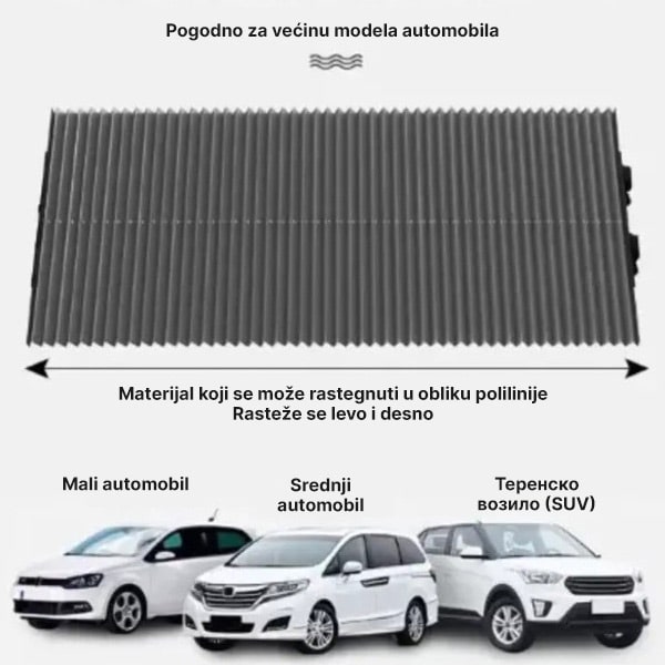 Ova zaštita od sunca je dizajnirana da odgovara širokom spektru vozila, uključujući automobile, kombije, kamione i SUV-ove. Univerzalno je prilagodljiva jer možete jednostavno iseći širinu na željenu meru.