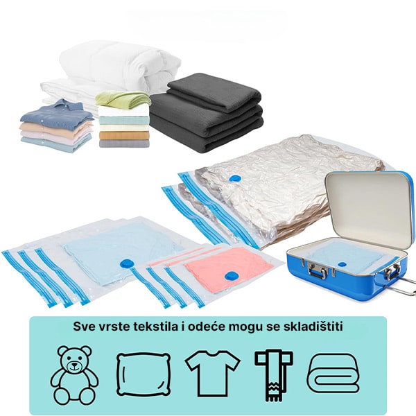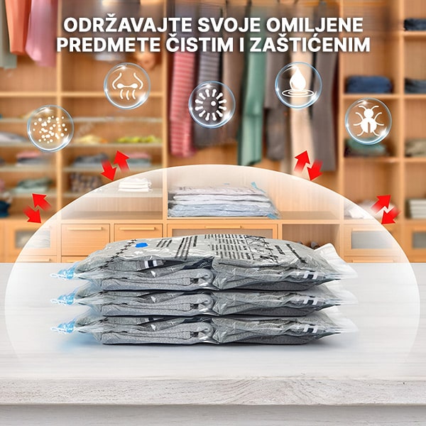 Nemate dovoljno prostora za skladištenje? Uštedite do 80% prostora sa našim vakuumskim vrećama za skladištenje! Jednostavno spakujte – zapečatite – i usisajte vazduh kako biste smanjili glomazne predmete poput odeće, ćebadi i posteljine. Više prostora, manje nereda!
